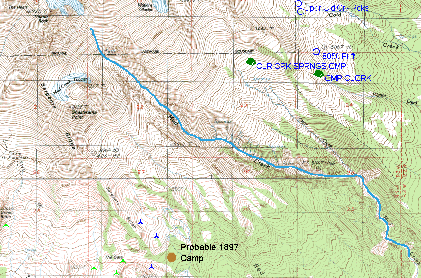 " During our circuit of the mountain, made near timberline the latter part of July, we saw what we took to be signs of conies among rocks east of Mud Creek Canyon, but finding no more believed we had been mistaken, until the evening of July 24, when we camped on some rivulets of snow water on the north side of Shastina. Here we found a small scattered colony reaching up in the slide rock from about 8,000 to nearly 10,000 feet, and a specimen was secured by Vernon Bailey. The next day we found signs in Cascade Gulch a mile or two northwest of Horse Camp. Later, when camped in the alpine hemlocks on the small west branches of Squaw Creek, we found a colony in the slide rock close by. Conies were afterwards found on both sides of Red Butte and on the east side of Gray Butte, and Osgood heard one near the head of Mud Creek Canyon."